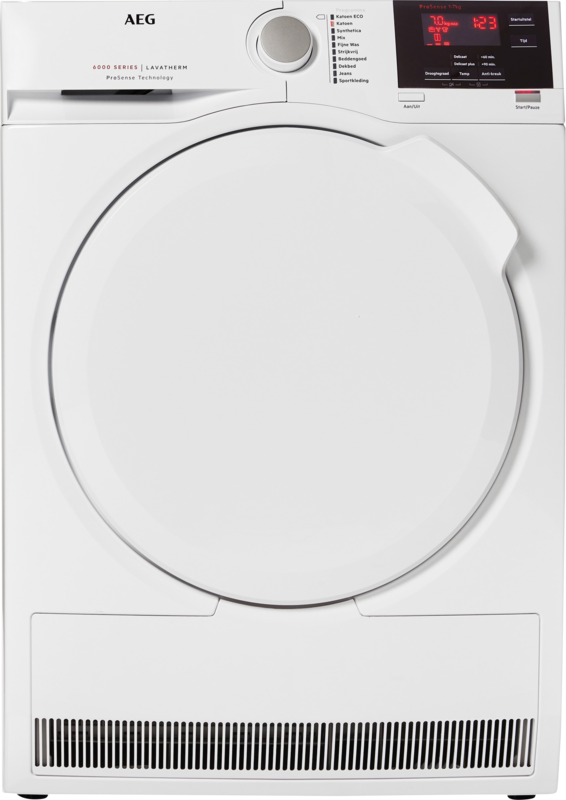 De AEG Lavatherm T6DB72GP is een condensdroger voor kleine ladingen wasgoed. In de trommel is plek voor 7 kilo wasgoed, wat prima is voor een huishouden van één persoon. Zodra je 1 van de 10 programma’s hebt gestart, draait de trommel verschillende richtingen op. Je wasgoed draait hierdoor niet in elkaar en je krijgt een gelijkmatig droog resultaat. ProSense sensoren houden voortdurend de vochtigheid van de stof in de gaten. Is het wasgoed droog genoeg dan stopt de wasdroger automatisch met drogen. Een volle belading wasgoed is in 129 minuten droog. Door de hoge droogtemperatuur droog je wel minder zuinig. Het vocht uit je wasgoed komt in het condensreservoir. Wil je dit vocht met een slang afvoeren via de waterafvoer, koop er dan apart een condensafvoerslang bij.