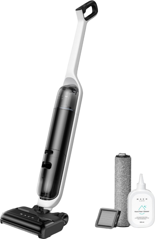 Met de Eufy MACH V1 stofzuig en dweil je jouw vloeren in één beweging. Zo verwijder je niet alleen kruimels en stof, maar ook hardnekkige vlekken van je vloer. Je reinigt altijd met een schone vloerborstel, omdat de borstel vuil afvoert en schoon water toevoegt. Hierdoor spoel je niet zelf de borstel uit onder de kraan. Als je de stofzuiger in het basisstation plaatst, maakt hij zichzelf schoon. Hierna blaast de stofzuiger ook zijn borstel droog met warme lucht. Tijdens de schoonmaak mengt de stofzuiger automatisch een goede verhouding van reinigingsmiddel en water. Zo gebruik je nooit teveel. Op het scherm lees je af welke stand je gebruikt en krijg je onderhoudsmeldingen. Op een volle accu maak je zo’n 45 minuten schoon.