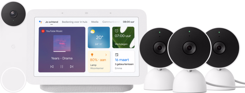 Beveilig je huis beter met deze combinatie 3 Google Nest Cams Indoor Wired, Google Nest Hub 2 en Nest Doorbell. De Nest Cam is een slimme beveiligingscamera die je zowel binnen als buiten bedraad aansluit. Deze IP camera werkt op een oplaadbare batterij, dus installeer je hem ook op een plek zonder stopcontact. De Google Nest deurbel sluit je ook bedraad of draadloos aan. De camera en deurbel onderscheiden personen, dieren en voertuigen van elkaar. Gebeurt er iets, dan krijg je een melding op je smartphone of de Google Nest Hub 2. Je ziet dan ook direct wat er in je tuin of huis gebeurt en praat via de app of Nest Hub terug. De Google Nest Hub 2 is een smart home hub met beeldscherm, die je helpt bij het aansturen van je slimme huis. Schakel jouw smart lampen in, lees recepten af of luister je favoriete muziek in goede geluidskwaliteit. Ook zie je op het scherm wie er voor de deur staat.