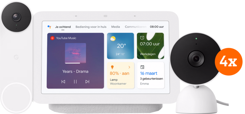 Beveilig je huis beter met deze combinatie 4 Google Nest Cams Indoor Wired, Google Nest Hub 2 en Nest Doorbell. De Nest Cam is een slimme beveiligingscamera die je zowel binnen als buiten bedraad aansluit. Deze IP camera werkt op een oplaadbare batterij, dus installeer je hem ook op een plek zonder stopcontact. De Google Nest deurbel sluit je ook bedraad of draadloos aan. De camera en deurbel onderscheiden personen, dieren en voertuigen van elkaar. Gebeurt er iets, dan krijg je een melding op je smartphone of de Google Nest Hub 2. Je ziet dan ook direct wat er in je tuin of huis gebeurt en praat via de app of Nest Hub terug. De Google Nest Hub 2 is een smart home hub met beeldscherm, die je helpt bij het aansturen van je slimme huis. Schakel jouw smart lampen in, lees recepten af of luister je favoriete muziek in goede geluidskwaliteit. Ook zie je op het scherm wie er voor de deur staat.
