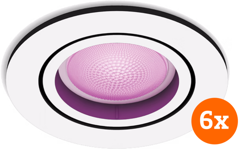 Het Philips Hue Centura Rond wit 6-pack is een set van 6 inbouwspots met een stralingshoek van 45 graden. Deze spots geven licht in 16 miljoen kleuren en alle tinten wit. Zo kies je altijd voor de juiste sfeer in je huis of op kantoor. Dankzij bluetooth heb je geen Hue Bridge nodig, maar bedien je de lampen direct met je telefoon. Via de Hue app stel je kleuren in en dim je het licht. Om de spots ook buitenshuis te bedienen of vaste routines in te stellen voeg je een bridge toe. Zo kom je nooit in het donker thuis, en ga je met een druk op de knop van romantische sfeerverlichting, tot huisfeest. Koppel de lampen aan je slimme assistent en integreer de verlichting met je smart home.