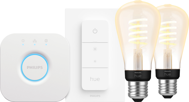 Met het Philips Hue Filament White Ambiance Edison 2-Pack Startpakket ga je direct aan de slag met slimme filamentlampen. Op het eerste gezicht lijken Hue filament lampen ouderwetse gloeilampen omdat je het gloeidraad ziet zitten. Toch zijn ze voorzien van slimme functies. De traditionele Edisonvorm van de lamp past in ieder interieur. White Ambiance lampen geven alle tinten wit licht. Met de juiste kleur licht op het juiste moment voel je je energieker. Je stelt de tint in via de meegeleverde dimmer, hiermee dim je ook je lampen. De Hue Bridge is meegeleverd in dit startpakket. Door je lampen aan de bridge te koppelen stel je ook routines in. Zo laat je de verlichting bijvoorbeeld langzaam aangaan vlak voor je wekker gaat.