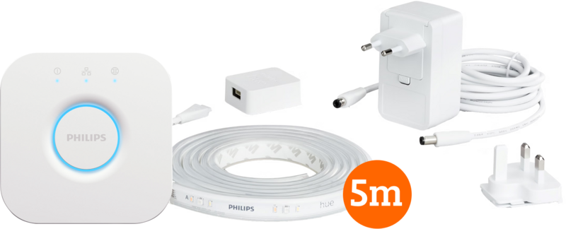 De Philips Hue Lightstrip 5 Meter basisset + bridge biedt je flexibele verlichting in 16 miljoen kleuren en alle tinten wit. Je bedient het licht via je Android of iOS toestel. Dit doe je met de meegeleverde Bridge. Dankzij de bridge bedien je de lampen ook buitenshuis en stel je routines in. Zo kom je nooit meer in het donker thuis. De strip knip je eventueel op maat en bevestig je vervolgens overal waar je wilt dankzij de handige plakstrip. De hoge lichtopbrengst maakt de Hue Lightstrip 2 Meter geschikt voor zowel decoratieve als functionele doeleinden. Gebruik hem bijvoorbeeld als sfeerverlichting onder de bar in de keuken. Ook kan hij de beleving van televisie kijken versterken wanneer je de strip synchroniseert met je tv. Deze lichtstrip verleng je tot maximaal 10 meter met extensies van 1 meter.