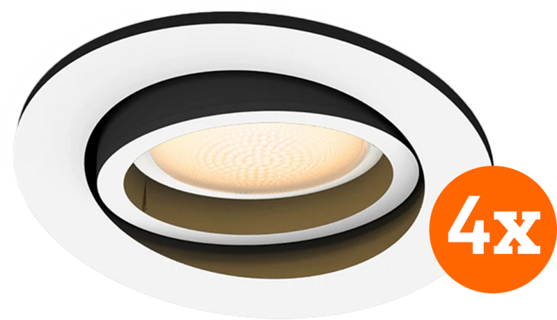 Met de Philips Hue Milliskin inbouwspot White Ambiance rond Wit 4-pack, maak je de perfecte sfeer voor ieder moment. Met deze 4 inbouwspots breid je gemakkelijk een bestaande set lampen uit, of creƫer je een nieuwe set voor een kleine ruimte. Deze spots geven in 3 tinten wit licht. Je bedient tot 10 lampen gemakkelijk met je telefoon via Bluetooth, je hebt dus geen Philips Hue Bridge nodig. Heb je even focus nodig, of wil je juist even uitrusten na een zware dag? Dan stel je gemakkelijk de perfecte sfeer in met je eigen licht recepten. Als je de lampen ook met je stem wilt bedienen koppel je ze gemakkelijk aan een spraakbesturingssysteem. Je bedient gemakkelijk tot 50 lampen en 10 accessoires zoals sensoren met de Philips Hue Bridge. Met de Bridge bedien je de lampen via internet, zodat je ze ook bedient wanneer je onderweg bent.