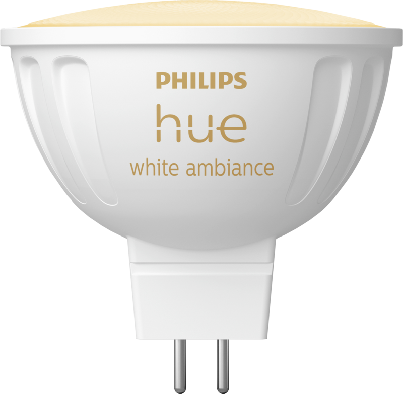 Deze Philips Hue White Ambiance MR16 spots zorgen voor sfeerverlichting in je huis. Een MR16 spot is een kleinere versie van een GU10 spot. MR16 wordt ook GU5.3 genoemd. Je herkent ze aan de platte bovenkant en de 2 contactpinnen. Deze spotjes geven iedere tint wit licht. Met een handomdraai verander je het licht van sfeerverlichting naar heldere werkverlichting Je verbindt de lampen via bluetooth direct aan je smartphone. Om de lampen ook buitenshuis te bedienen en vaste routines in te stellen, koppel je de lampen aan een Hue Bridge. Zo kom je nooit in het donker thuis.