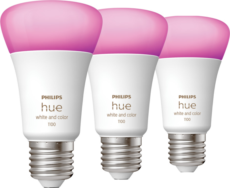 Het Philips Hue White and Color E27 1100lm 3-pack drie-pack is een set van 3 smart lampen die licht geeft in alle kleuren van de regenboog én meerdere tinten wit licht. Zo zorg je altijd voor de juiste sfeer in huis. Je kiest voor warm licht als je wilt relaxen, fel licht om je te concentreren en vrolijke kleurtjes tijdens een feestje. Deze lamp heeft een vermogen van 10.5 watt. Dat komt overeen met een ouderwetse gloeilamp van 100 watt. Zo zorg je voor verlichting in een gemiddeld grote kamer. Te fel? Dan pas je de lichtsterkte eenvoudig aan in de app. Je koppelt deze lampen via bluetooth direct aan je telefoon. Zo ga je direct aan de slag. Wil je meer dan 10 lampen in huis bedienen of extra opties zoals timers instellen of je smart lampen via internet bedienen? Dan koppel je de lampen eenvoudig met een Hue Bridge.