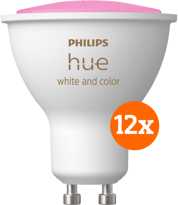 Het Philips Hue White and Color GU10 12-pack is een set van 12 slimme spots die licht geven in alle kleuren van de regenboog én meerdere tinten wit licht. Zo zorg je altijd voor de juiste sfeer in huis. Je kiest voor warm licht als je wilt relaxen, fel licht om je te concentreren en vrolijke kleurtjes tijdens een feestje. Via de app koppel je de lampen zelfs aan je Spotify playlist. Je bedient deze lampen met bluetooth, of via het internet met behulp van een Hue Bridge. Met een Bridge bedien je de lampen ook buitenshuis en stel je routines in. Zo gebruik je de lampen bijvoorbeeld ook als wake-up light.