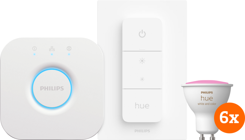 Start met smart verlichting met het Philips Hue White and Color GU10 smart lamp startpakket met 6 slimme spots en een draadloze dimmer. Ook levert Philips standaard een Philips Hue Bridge mee met dit pakket. Daarmee bedien je jouw smart lampen altijd en overal. Ook als je niet thuis bent. Via de Hue app stel je verschillende kleuren en scĆØnes in. Deze lampen geven 16 miljoen verschillende kleuren licht, en alle tinten wit licht. Zo zorg je altijd voor de juiste sfeer in je huis. Dankzij de meegeleverde dimmer bedien je de lampen ook zonder telefoon. Je dimt deze of schakelt ze in en uit. Je breidt de set later eenvoudig uit. Aan 1 Hue Bridge koppel je namelijk 50 smart lampen.